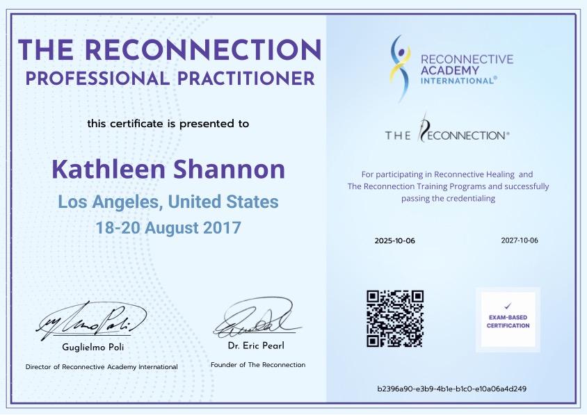 I am a Personal Reconnection Certified Practitioner, trained by Dr. Eric Pearl and his teaching staff. You can see my certification here or call The Reconnection office at (323) 960-0012 in Los Angeles, California for verification.